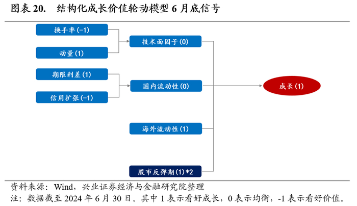 结构化模型6月底给出风格偏成长的信号。从具体风格驱动因素看,各维度信号有所分化。历史上当以万得全A换手率为代表的交易活跃时,代表市场风险偏好较高,相对利好成长风格的表现。当前市场换手率指标依然在过去2年的15%分位数位置,说明活跃程度相对较低,价值相对占优。但是过去一个月成长代表指数动量相对略占优,因此技术面维度总体信号均衡。从流动性角度看,当国内外流动性较好时,相对利好成长风格。国内流动性中,中长期贷款增速还处于下行状态,广义流动性还不够好,总体利好价值风格。国外流动性主要指美债利率的变动,这个指标历史上对成长价值相对走势的解释力极强。本轮加息处于尾声,美债利率出现下行迹象,相对利好成长风格。另外,股市反弹期因子显示股市整体性价依然处于极端高位,从反弹角度给出弹性更高的成长风格有望占优的信号。综合来看,各因子信号加总后认为成长风格相对占优。