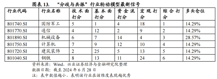 根据截至2024年6月28日的“分歧与共振”行业轮动模型结果,排序最靠前的6个行业分别是:国防军工、通信、机械设备、计算机、建筑装饰、钢铁。在经过宏观日历效应的调整后,各行业持仓权重分别为:14.29%、14.29%、28.57%、14.29%、14.29%、14.29%。