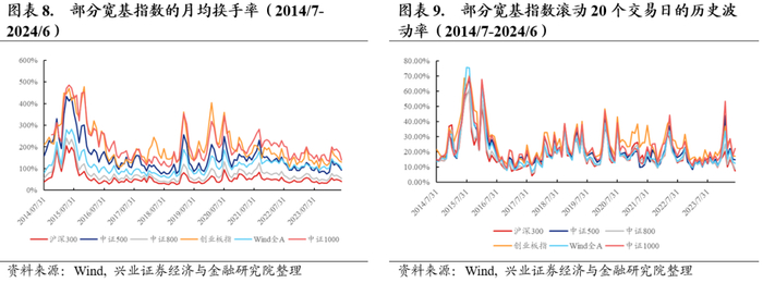 交投维度,相较于2024年5月的水平,6月主流宽基指数的换手率小幅下行:目前Wind全A、沪深300、中证500、中证800、创业板指、中证1000换手率均低于近10年以来的中位数水平。本月各主流宽基指数维持震荡,除创业板指外,各大指数的波动均较上月有所下行;从时间序列来看,除中证1000外,各指数波动率均低于近10年以来的中位数水平。