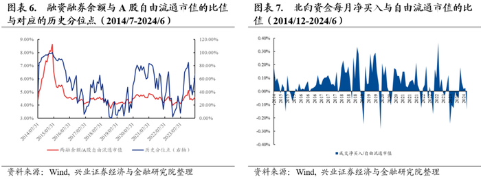 资金维度,截至2024年6月28日,两融余额为1.5万亿元,基本与上月末水平持平,同时A股自由流通市值小幅降低,因此,整体而言两融余额与自由流通市值比值上升,目前位于近10年以来的67%分位点左右;近期,北向资金在经历了前期的持续净流入状态后,再度转为净流出,2024年6月北向净流出444.45 亿元。