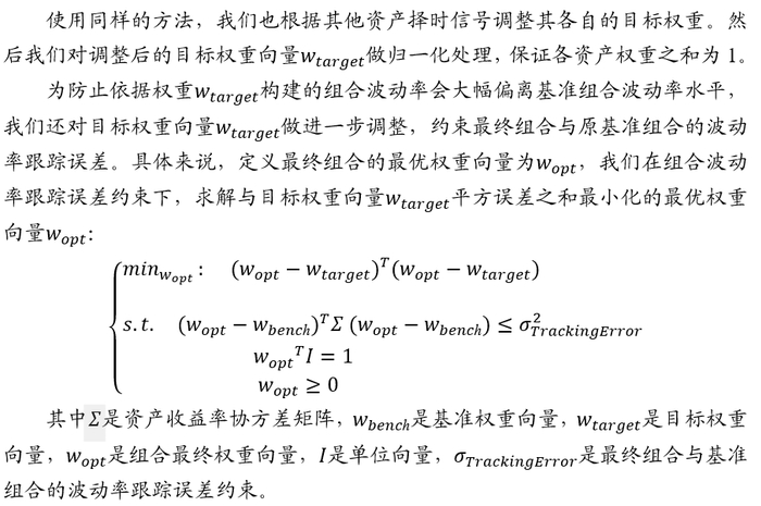 另外,在本报告多资产配置组合中,由于可能有多个同类型资产(如5种股票资产),这时单个股票资产的权重向上调整空间计算方法有所不同。我们先获得所有股票资产权重之和的向上调整空间,然后将此调整空间除以择时信号为看多的股票资产数量即得到每个股票的权重向上调整空间。