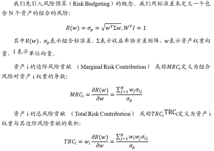 风险预算模型是通过使每种资产对组合整体的风险贡献权重等于提前设定的风险预算来达到分散风险的目的。本质上,风险预算策略放弃了对回报率的预测而将重点放在了对风险编制预算的环节。