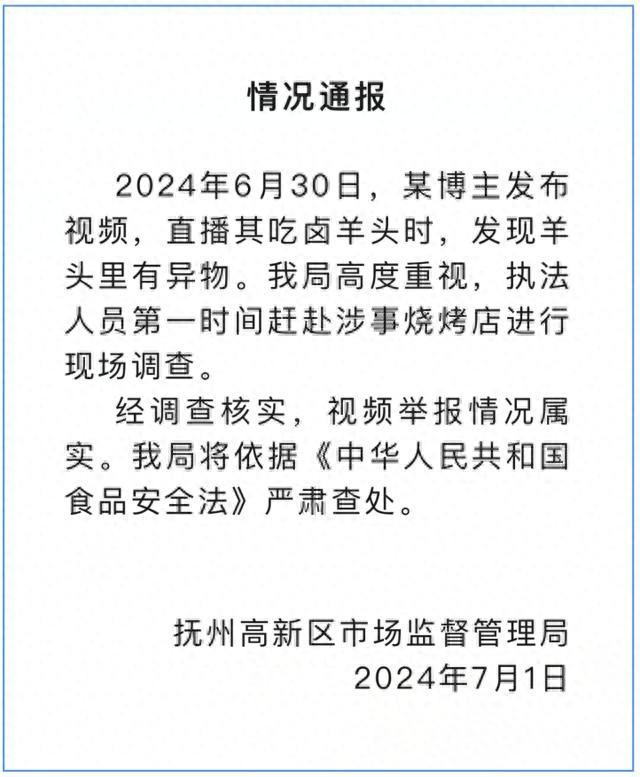 7月1日晚,据江西抚州高新区市场监督管理局通报,6月30日,某博主发布视频,直播其吃卤羊头时,发现羊头里有异物。该局高度重视,执法人员第一时间赶赴涉事烧烤店进行现场调查。经调查核实,视频举报情况属实。该局将依据《中华人民共和国食品安全法》严肃查处。
