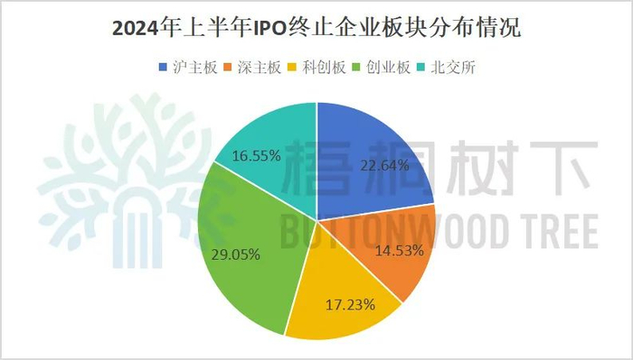 截至6月30日,2024年上半年IPO终止的企业共有296家,其中,1家在上市委会议被否决,268家在过会前撤回,23家过会后撤回而终止,4家在注册阶段终止。从拟上板块看,创业板终止86家,沪主板67家,科创板51家,北交所49家,深主板43家;从终止时间看,6月份终止数量最多,高达116家;从地区分布看,江苏、广东、浙江的终止企业最多,分别有49家、47家、42家;从保荐机构项目情况看,中信证券终止项目数量最多,有37单,其次是中信建投证券,有24单,海通证券、中金公司各有22单项目终止。