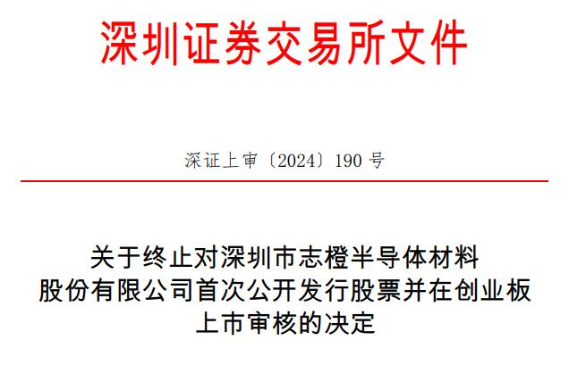 日前,志橙股份向深交所提交了《深圳市志橙半导体材料股份有限公司关于撤回首次公开发行股票并在创业板上市申请文件的申请》,保荐人向深交所提交了《国泰君安证券股份有限公司关于撤回深圳市志橙半导体材料股份有限公司首次公开发行股票并在创业板上市的申请》。根据《深圳证券交易所股票发行上市审核规则(2024年修订)》第六十二条的有关规定,深交所决定终止对志橙股份首次公开发行股票并在创业板上市的审核。