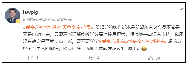 今天一早,#爱奇艺被判补偿41天黄金VIP会员#话题词冲上热搜第一。