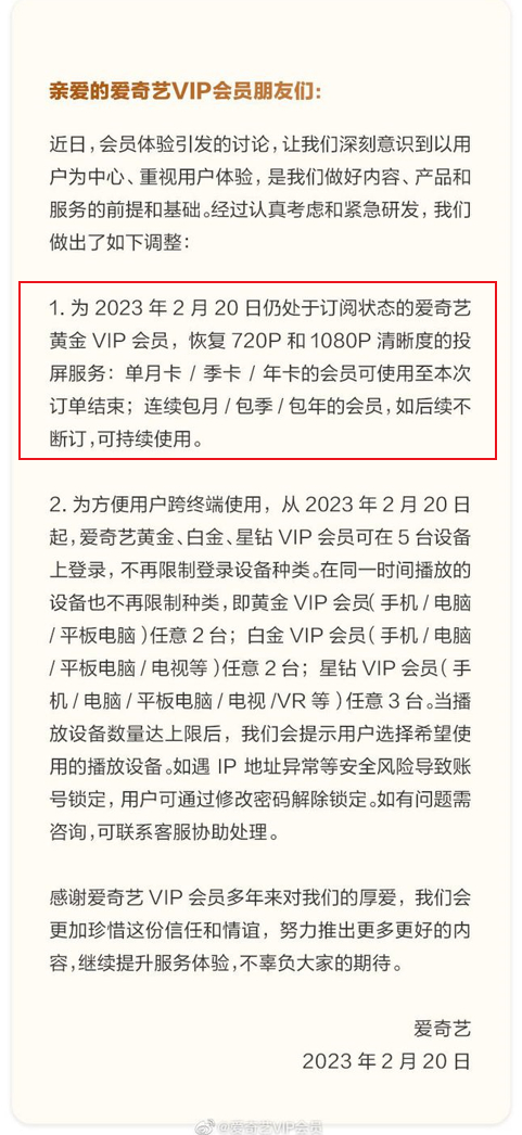 2023年2月20日,爱奇艺官方微博发布关于爱奇艺会员服务优化情况说明,对投屏功能作出调整,仍处于订阅状态的爱奇艺黄金VIP会员,恢复720P和1080P清晰度的投屏。
