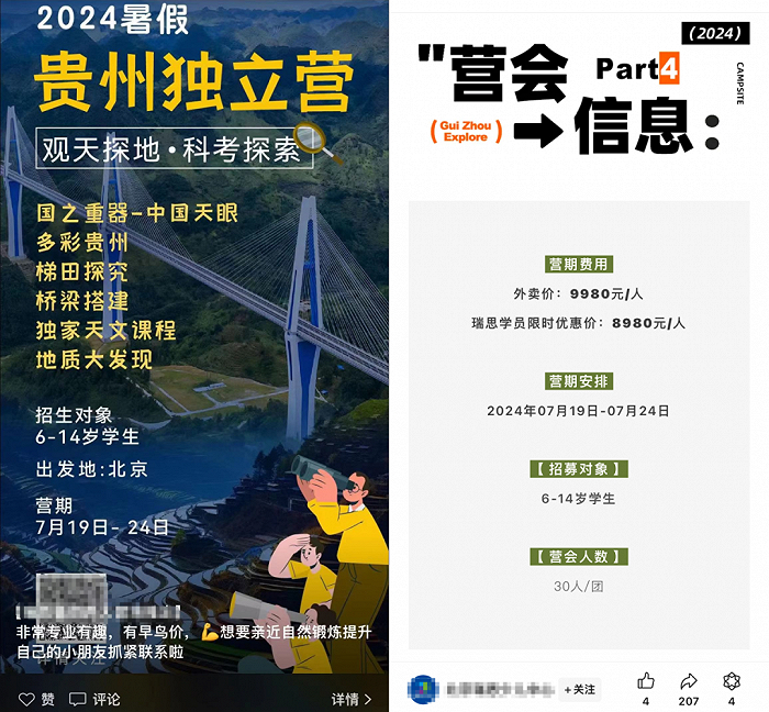比如一家英语机构发起的贵州游学营,5晚行程,会员价8980元;一家体能训练机构发起的皮划艇/桨板双证营,6天晚,6980元。还有些朋友转发的海外游学团,起步价都是5位数。
