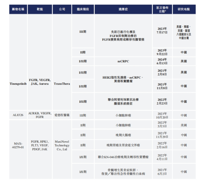 但是,Tinengotinib也面临着潜在的竞争对手。截至最后实际可行日期,已知有一款靶向FGFR的MTK抑制剂(厄达替尼)获得FDA批准,另外,包括Tinengotinib在内,至少有三款处于临床阶段的靶向FGFR以及JAK、Aurora及VEGFR中一种或以上的MTK抑制剂。