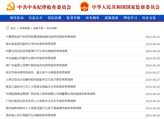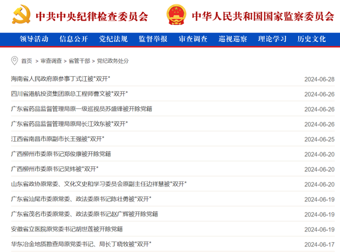 此外还有:国家税务总局四川省税务局原副巡视员饶勇被开除党籍;国家金融监督管理总局行政处罚局原负责人王柱被开除党籍和公职;广东省药品监督管理局原党组书记、局长江效东被开除党籍和公职;贵州省红十字会原党组书记、常务副会长王开禄被开除党籍和公职,等等。