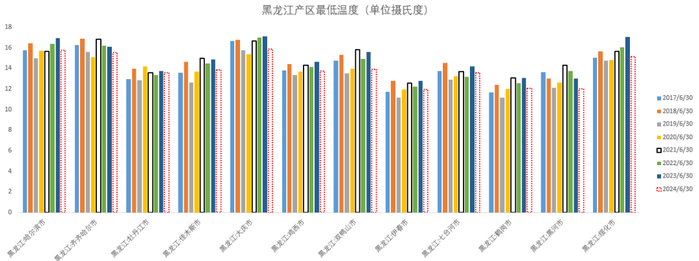 从最低温度的表现来看,2019年和2020年是温度偏低的年份。不过大部分地区比2019年和2020年的时候还要高,除了齐齐哈尔、黑河、双鸭山、牡丹江和伊春。