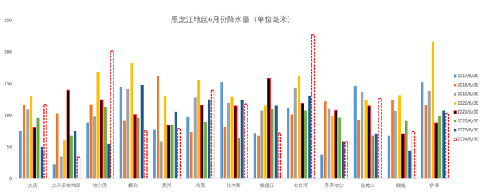 从最低气温的角度看,2024年6月最低气温比较2019年的话,齐齐哈尔和黑河地区温度较之2019年6月份低,这两个地区产量占比合计在48%,大致在450万吨。2024年最低气温比较2020年的话,牡丹江、双鸭山、伊春、黑河地区气温偏低。这些区产量占比合计在44%,大致在410万吨。