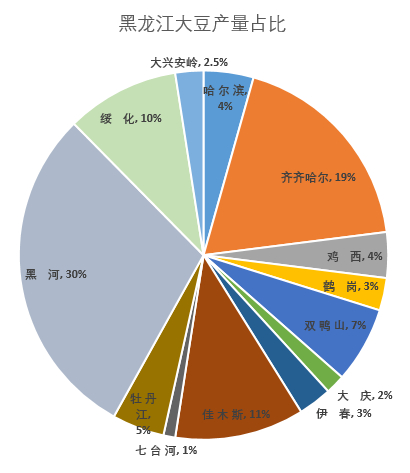 黑龙江大豆产量主要集中在黑龙江西北部,其中西北部产区黑河、齐齐哈尔、绥化占比合计为59%。中东部佳木斯占比较大,占11%。四个产区占比在7成左右。