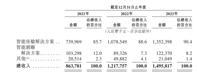 产品销量和客户数量的双重提升,助力博泰车联网的智能座舱解决方案业务的营业收入从2021年的7.4亿元提升至13.5亿元,占总营收的比例也稳步提升至90%以上为90.4%。
