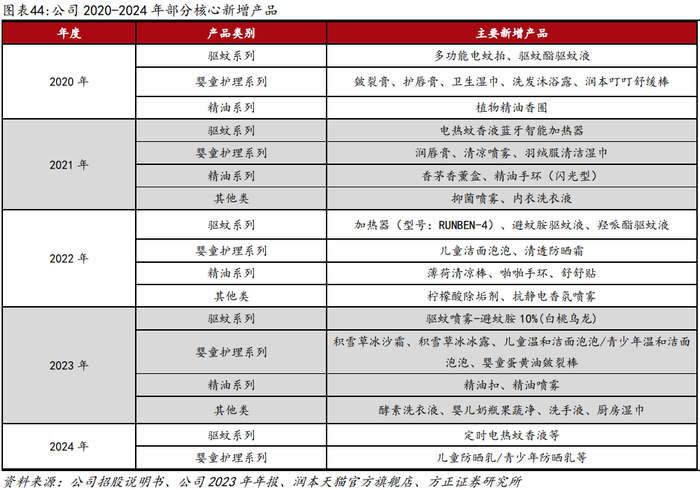 创新挖掘多个细分“小品类”需求,构建差异化产品矩阵,汇聚细分引领优势打造“大品牌”认知。公司以驱蚊产品作为市场切入点和基本盘,依托在驱蚊市场的地位迅速拓展至更为广阔的个人护理市场。公司坚持“大品牌、小品类”战略,持续挖掘个性化细分需求/场景,不断创新拓展产品功能和使用场景,在各个细分赛道中均打造差异化产品壁垒,成为个性化细分需求引领者,将多个细分“小品类”引领优势汇聚成润本“大品牌”的优势。