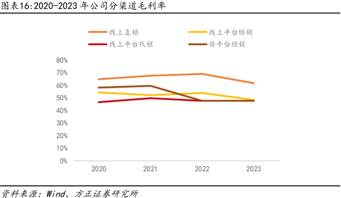 由于直销模式下公司拥有零售端的自主定价权且直销可直接触达消费者、节省成本费用,线上直销渠道的毛利率显著高于其他渠道。23年公司线上直销、线上平台经销、线上平台代销、非平台经销的毛利率分别为61.83%/+3.45pct、48.65%/-2.95pct、47.64%/+5.05pct、47.74%/+1.69pct(考虑口径变化)。
