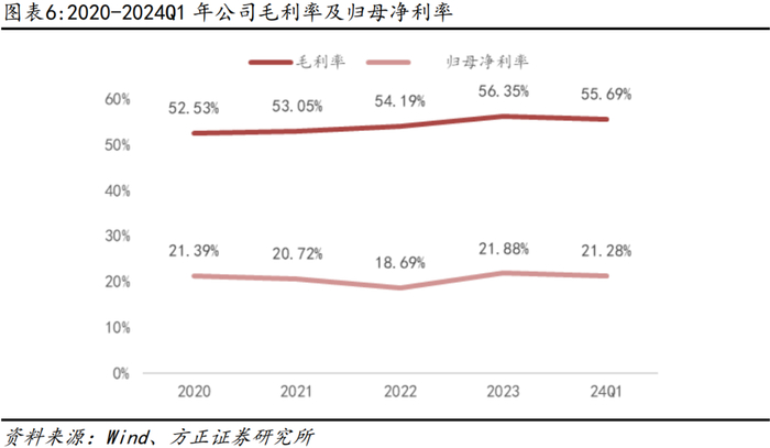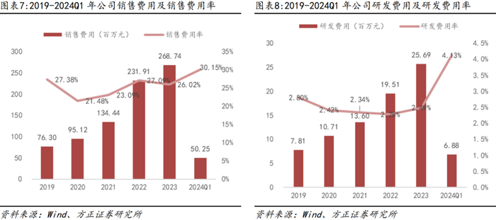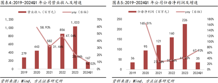 公司收入业绩均呈现持续高增的态势,利润增长弹性更高。23年公司营业收入10.33亿元,同比+20.7%,4年CAGR为38.8%;24Q1营收1.67亿元/同比+10.02%。23年公司归母净利为2.26亿元,同比+41.2%,4年CAGR为58.7%,24Q1归母净利润0.35亿元,同比+67.93%。