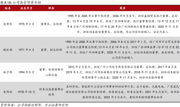 公司管理层高度集中且相关从业经验丰富。赵贵钦、鲍松娟为公司联合创始人和实际控制人,两人均有10年以上的个体经营经验,商贸管理经验丰富,有助于公司管理和战略决策。董事林子伟电商行业从业经验丰富,有望赋能公司线上渠道运营,进一步巩固公司在线上渠道所占有优势。