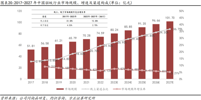 我国驱蚊行业规模整体稳步增长。我国驱蚊市场规模(狭义的驱蚊,不包含杀虫)由2017年的51.81亿元增至2022年的74.59亿元,5年CAGR为7.56%,预计2027年市场规模可达101.70 亿元,2022-2027年CAGR预计为6.40%。