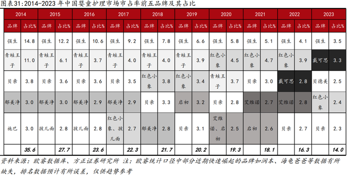 2014-2017年:强生、青蛙王子龙一龙二份额快速下行,整体TOP4排名相对稳定,3年CR5下滑约13.3pct。