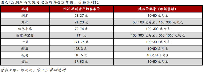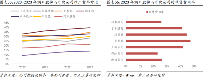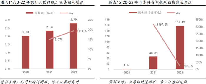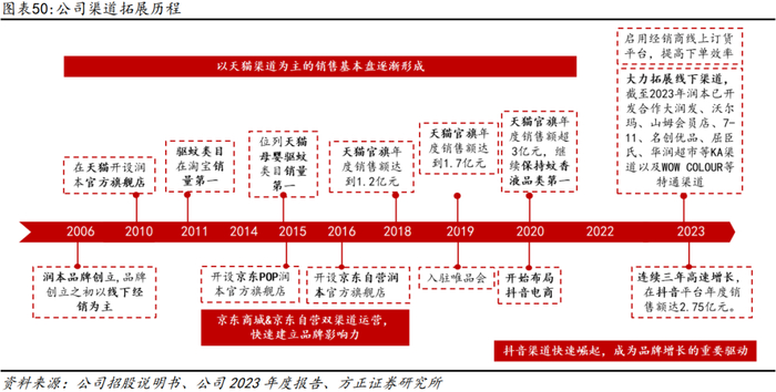 渠道拓展路径剖析:品牌成立之初以线下经销为主,由于拓展和维护线下渠道费用较高,2010年公司把握电商发展契机开设天猫“润本旗舰店”,切入线上流量入口。后续进一步拓展线上销售渠道,开拓京东、唯品会、拼多多等多个平台渠道,加速电商全渠道建设。2020年公司瞄准抖音渠道流量红利及视频传播的优势,开拓抖音新渠道并持续发力,抖音渠道现已成为公司收入的主要来源之一。公司在线上占据领先地位后开始大力加码线下渠道,当前已形成完整的全渠道销售网络。