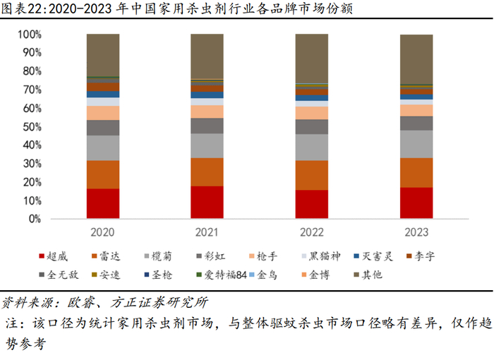 杀虫剂市场竞争格局较为稳定,CR5多年保持在60%上下。近年杀虫剂市场CR5基本保持在60%左右,在2018年后集中度有小幅下降的趋势。从各品牌市占率看,竞争格局呈现多强并存的局面,前三大品牌市占率均超过10%。