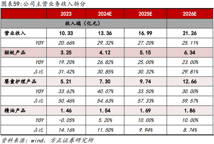 23年公司驱蚊业务营收3.25亿元/同比+19.20%,24-26年预计营收为4.12、5.15、6.34亿元,同比+26.82%、25%、23%。