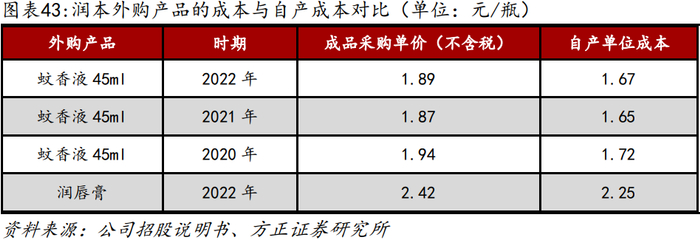 自研自产筑牢产品高质价比基础,保障公司盈利优势。润本旗下的产品价格主要集中在30-40元之间,无论是驱蚊还是婴童护理产品,润本都能做到品质高于同价位竞争对手而价格低于同产品质量的竞争对手。高质价比的背后是以自产为主的生产模式为公司盈利提供保障,公司外购产品成本略高于自产成本,以自产为主有利于公司控制成本,在低价的情况下仍能维持较高的毛利率。