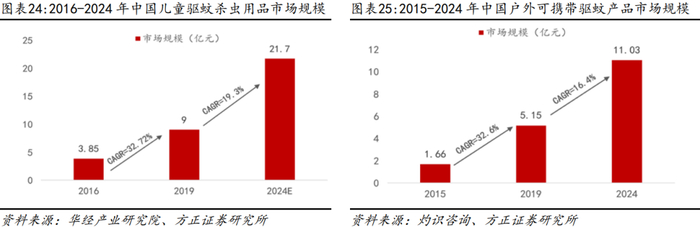 儿童驱蚊快速发展,其中温和便携产品优势更突出。2016-2019年,中国儿童适用驱蚊产品零售额从3.85亿元增长至9亿元,CAGR为32.72%,预计2024年市场规模将达到21.7亿元,19-24年预期CAGR为19.3%。基于母婴人群对驱蚊产品安全便携性的重视,绿色温和类涂抹式产品、小型便携式驱蚊设备等新型驱蚊产品或成为竞争格局优化的破局之道。