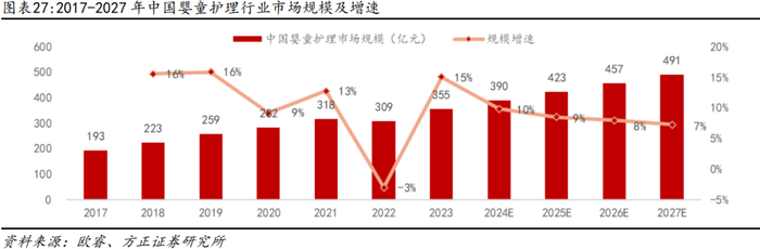 得益于年轻一代父母育儿需求精细化,中国婴童护理市场实现稳健持续增长。随着婴童护理市场不断发展,消费者呈现出日益多元细分的消费诉求,推动婴童护理产品功能及使用场景进一步细分和拓展,带动行业规模增长。根据欧睿数据库,2017-2023年中国婴童护理市场规模由193亿元增长至355亿元,CAGR为10.7%,预计2027年中国婴童护理市场规模将达到491亿元,2023-2027年CAGR为8.4%。