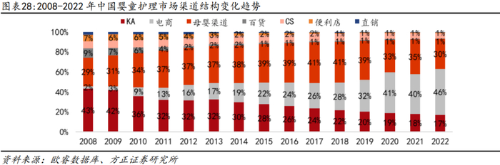 2011-2019年:传统电商快速崛起,KA、商超渠道份额显著下滑,专业母婴渠道占比整体稳定上行。红色小象和启初等崛起。