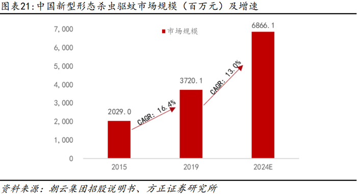 新型驱蚊产品快速崛起,为我国驱蚊杀虫市场带来强劲增长动力。中国新型形态杀虫驱蚊市场规模由2015年的20.29亿元增长至2019年的37.20亿元,CAGR为16.36%,预计2024年增长至68.66亿元,19-24年CAGR为13.0%,远高于传统形态杀虫驱蚊增速(1.7%)。2019年中国新型形态杀虫驱蚊产品(包括电热蚊香片、热蚊香液及户外可携带产品)占所有杀虫驱蚊产品的零售额约44%,而在一些发达国家市场,该比例常常超过70%,由此可见新型杀虫驱蚊产品实现替代仍有巨大的空间。