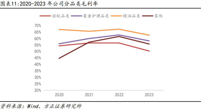 婴童护理业务收入高速成长,4年CAGR57%成为第一大业务。23年公司婴童护理业务收入为5.21亿元/+33.6%,4年CAGR为57.3%。2022年婴童护理以45.6%的占比超越驱蚊成为公司收入占比最大的业务,23年婴童护理占比持续上升至50.5%(同比+4.9pct),4年占比累计提升19.9pct。婴童护理品类23年毛利率58.30%,考虑会计准则调整同比+2.66pct,报告期内毛利率呈现持续提升态势。