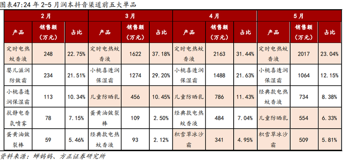 2 重磅新品快速放量:24年新品定时蚊香液上新,一经推出迅速起量成为润本第一大单品,4、5月GMV均超2000万元;24年重磅上新儿童防晒乳在抖音渠道快速起量,3-5月均位居润本抖音TOP5单品。23年推出的新品积雪草冰沙霜主打晒后修复,该单品24年升级2.0版,舒缓力&保湿力进一步提升。2024年润本积雪草冰沙霜4月抖音销售额341万元/占比4.95%,5月抖音销售额509万元/占比5.81%,连续两个月位居润本抖音第五大单品。