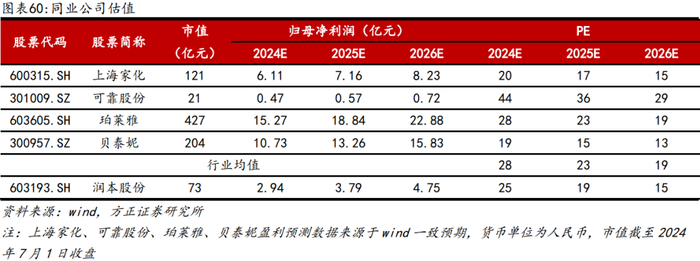 我们选取与公司同样拥有多元个护品类的美妆/个护公司上海家化、可靠股份、珀莱雅、贝泰妮为可比公司,平均24-26年P/E均值为28/23/19x。综上,预计24-26年营业收入13.36、16.99、21.26亿元,对应增速为29.33%、27.20%、25.11%;预计24-26年归母净利润分别为2.94、3.79、4.75亿元,对应增速分别为30.23%、28.79%、25.22%,对应PE为25、19、15X,维持“强烈推荐”评级。