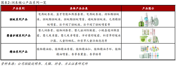 公司以“润本”为核心品牌,从驱蚊领域切入并拓展多细分赛道,目前已形成驱蚊、婴童护理、精油三大核心产品系列。三大核心产品系列营收占比合计超过90%。通过坚持“大品牌、小品类”的研产销一体化战略,润本立足优质产品和高性价比并抓住线上渠道红利,在驱蚊及婴童个护领域持续创新打造差异化竞争力。经过十余年深耕,“润本”已快速成长为知名优质国货品牌。