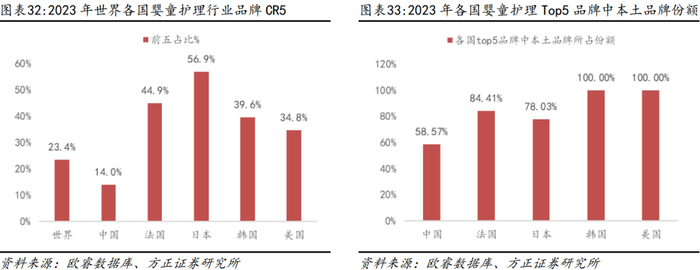对标海外,我国婴童护理行业集中度仍有提升空间,国货品牌具有本土优势有望跑出龙头。相较日、韩、法、美等发达国家和世界总体水平,我国婴童护理行业集中度目前处于低位,2023年中国婴童护理品牌CR5为14.0%,相较于CR5最高的国家日本低42.9pct。近年我国婴童护理行业有启初、红色小象、薇诺娜宝贝、戴可思、润本等国货品牌相继崛起,虽暂未跑出大龙头,但部分品牌市占率持续提升,未来前景可期。