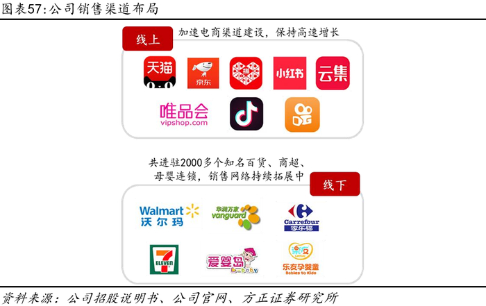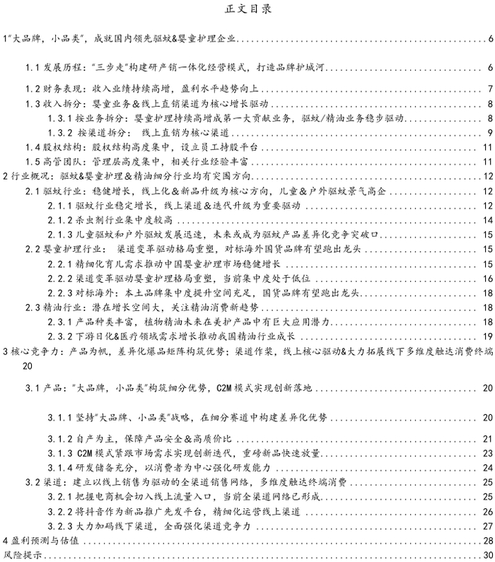 核心竞争力:产品为帆,差异化产品矩阵构筑优势;渠道作桨,线上核心驱动&大力拓展线下多维度触达消费终端。公司坚持“大品牌、小品类”战略,聚焦打造小品类高市占率爆品,差异化构建 “婴童护理+驱蚊+精油”矩阵,在细分赛道中构建差异化优势。自产保障产品高质价比,C2M模式快速捕捉消费者需求变化,通过适时升级迭代产品&持续拓新优化产品矩阵,进而巩固市场地位、提高市场份额。公司把握电商发展契机切入线上流量入口,具备明显先发优势;持续开拓和深耕线上渠道,形成较强线上渠道运营能力,进一步放大公司产品端优势。以线上为核心驱动,公司逐步开拓线下渠道,建立起线上线下相结合的全渠道销售网络。
