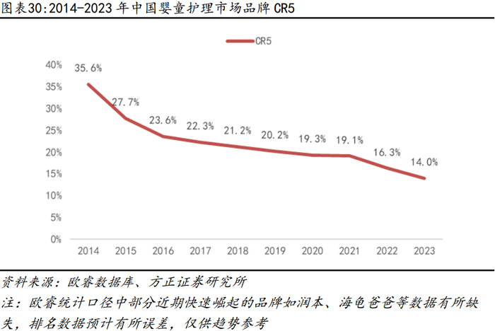 行业集中度处于历史低位,竞争格局有待重塑。近十年中国婴童护理行业龙头企业集中度下滑趋势显著,CR5由35.6%降至14.0%。其中2014-2017年快速下行,2017年以来稳步下行,2022年起又有加速下滑的趋势。龙头份额下滑显著,但新品牌迭代频繁,未能实现承接成为龙头。