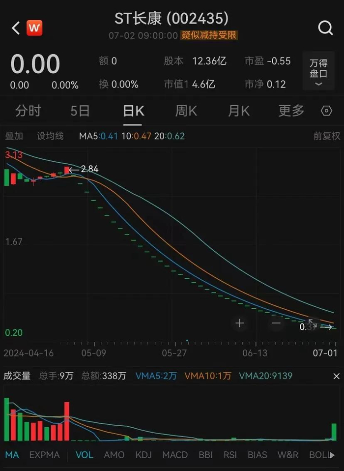 5月6日复牌后,ST长康开启了连续跌停之路,截至7月1日,已连续40个交易日跌停。