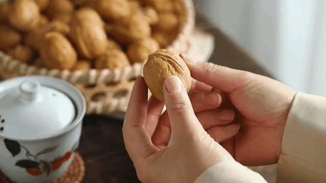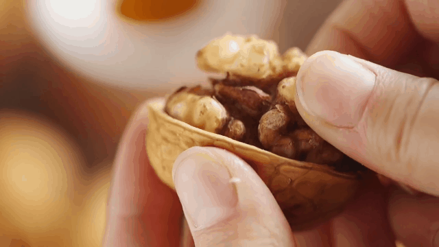 剥开的核桃仁褶皱纹路丰富,色泽金黄,刚拿出来就能闻见浓浓的坚果香气。