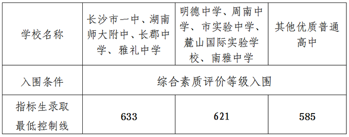 A档:长沙市第一中学、湖南师范大学附属中学、长郡中学、雅礼中学、明德中学(含美术班、音乐班)、周南中学、长沙市实验中学(含音乐班)、麓山国际实验学校、南雅中学。