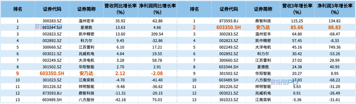 当然,若拉长周期看,安乃达的长期表现仍然可圈可点。截至2023年,安乃达营收近3年增长率高达85.66%,在13家公司中排名第2位;净利润近3年增长率为88.83%,排名第3位(见表2)。