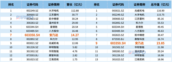 从收入规模看,安乃达2023年的营收为14.27亿元,排在13家公司的第7位。而13家公司中,大洋电机是唯一一家收入超百亿的行业企业,2023年收入规模高达112.88亿元。