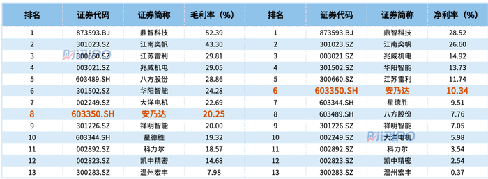 在最核心的盈利能力指标上,13家公司中,盈利能力指标表现最优秀的公司是鼎智科技,销售毛利率和净利率分别高达52.39%和28.52%,紧随其后的是江南奕帆,销售毛利率和净利率分别为43.3%和26.6%。而安乃达2023年的销售毛利率和净利率只有20.25%和10.34%,分别排在13家公司中的第8位和第6位(见表3)。