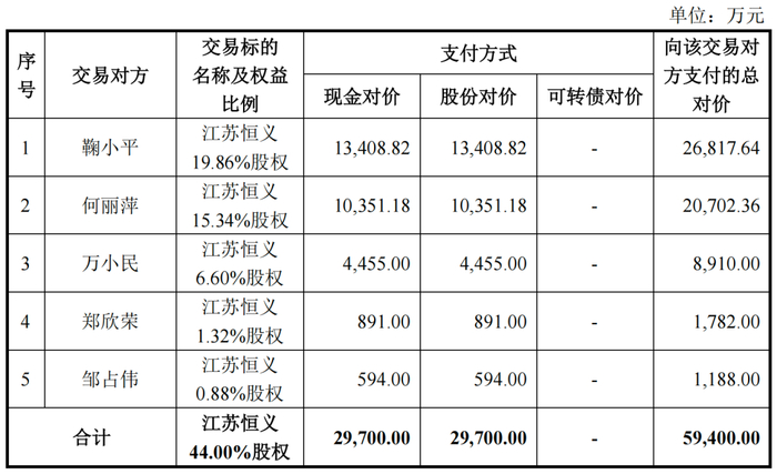 重组草案显示,华达科技拟作价5.94亿元,以发行股份及支付现金的方式购买鞠小平、何丽萍、万小民、郑欣荣、邹占伟持有的江苏恒义合计44%的股权,其中2.97亿元以股份进行支付,另外2.97亿元通过发行股份募集配套资金进行现金支付,配套资金认购方为35名符合条件的特定投资者。最终募集配套资金成功与否或是否足额募集均不影响发行股份及支付现金购买资产的实施。