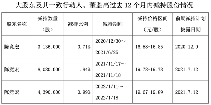 而这并非陈竞宏首次套现。在上市36个月限售期满后,2020年12月30日-2021年6月25日,2021年11月17日-2021年11月18日,因个人资金需求及财务规划,陈竞宏累计减持2.85%,累计套现约2.12亿元。