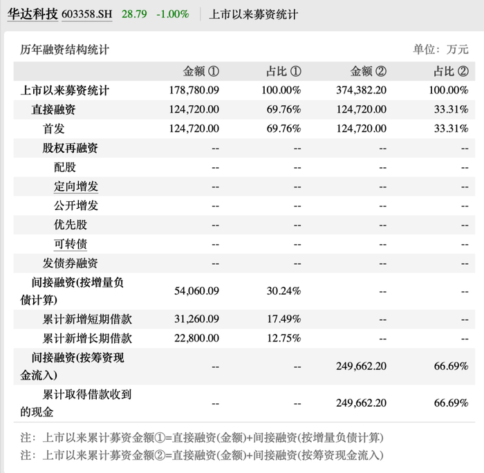 华达科技成立于1980年,1990年进入汽车零部件行业,并于2017年1月25日在上交所挂牌上市,首发融资12.47亿元,用于扩产汽车零部件,以及补充流动资金。上市以来累计募资金额(按筹资现金流入)37.44亿元。