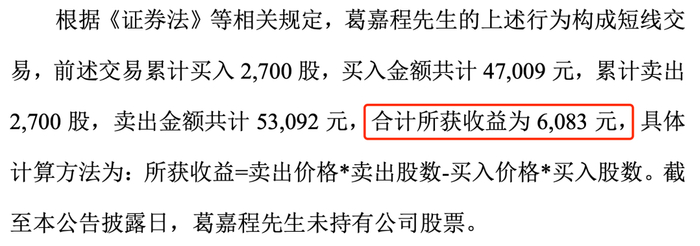 2023年7月11日-8月29日期间,葛嘉程分6次买入华达科技2700股,合计耗资47009万,又在10月27日-12月4日期间分4次卖出,套现53092万元。持有5个月时间,合计获利6083元,葛嘉程并非华达科技股东,所得利润于2024年1月18日上交至公司账户。