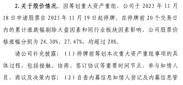 问询函还指出,因筹划重大资产重组,公司于2023年11月18日申请股票自2023年11月19日起停牌。在停牌前20个交易日内的累计涨跌幅剔除大盘因素和同行业板块因素影响,公司股票价格涨幅分别为24.30%、27.47%,均超过20%。